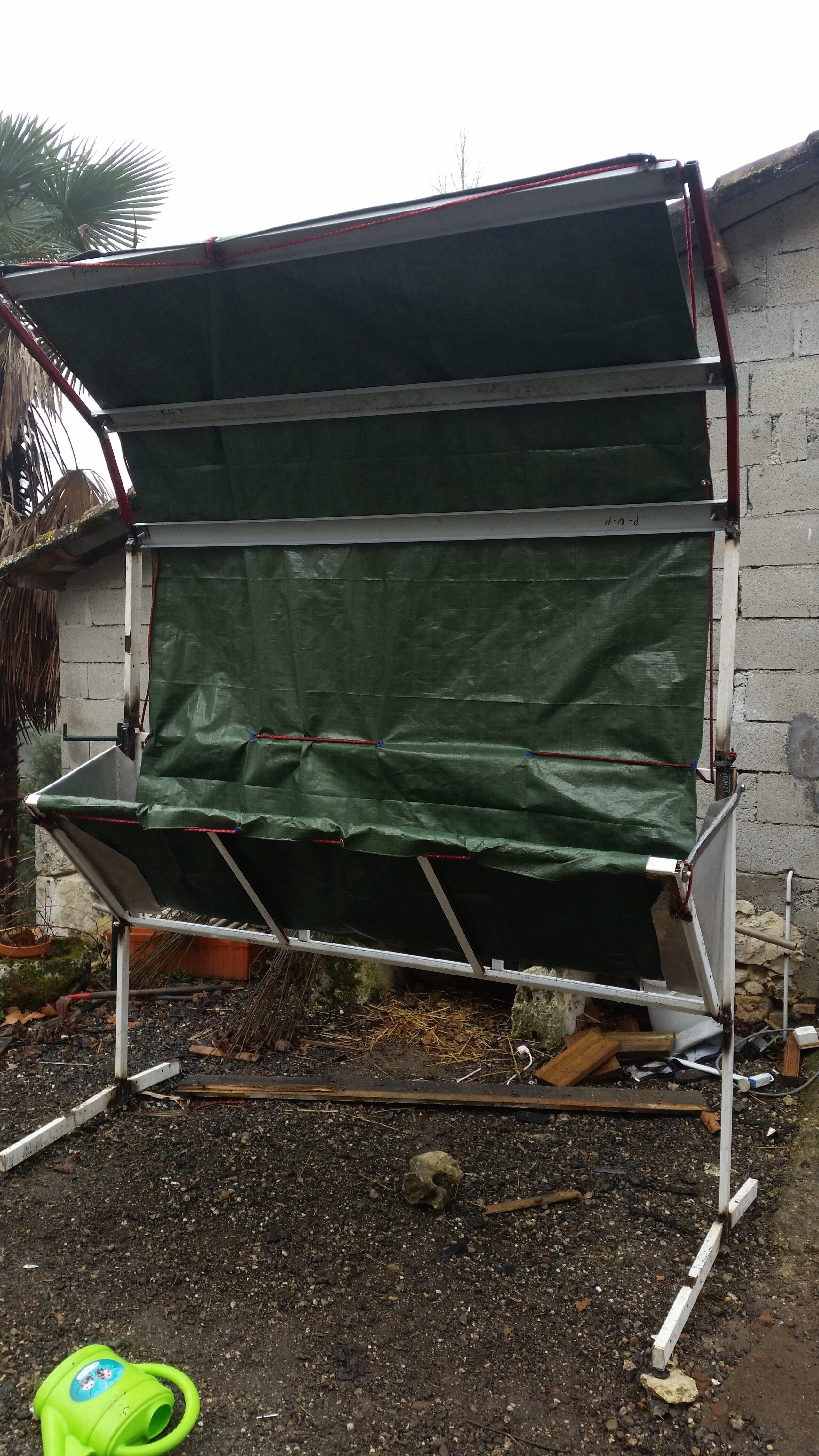 suite à la construction de la cabane j’ai réaliser un râtelier de 1.9m de larged une capacité 2 petite bote de foin avec abri .