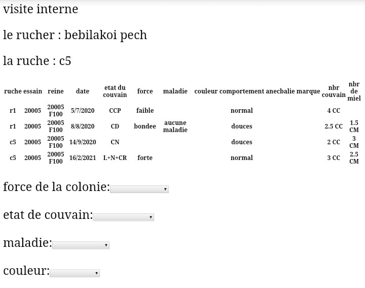 Pour ma premier visite de année je me suis servie de mon logiciel que j’ai réaliser pour rentrer les donner pour imprimer mon registre élevage. Et aussi un de faire le suivie facilement en rentrent les donner directement sur le rucher grâce au serveur prévue pour être utiliser avec un connexion bas débit du téléphone quant on a du mal a avoir du réseau sur le rucher . Et avoir un minimum info pour prendre une décision .